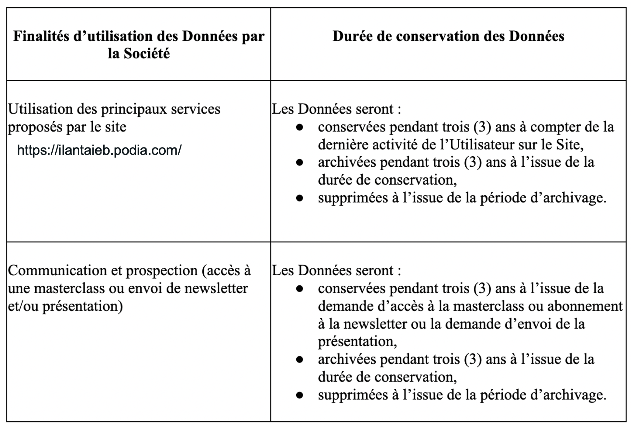 Une fois la phase de conservation dite « active » passée, la Société procédera à l’archivage intermédiaire desdites Données (c’est-à-dire que les données personnelles ne sont plus utilisées pour atteindre l’objectif fixé mais présentent encore un intérêt administratif pour la Société (ex : gestion d’un éventuel contentieux, etc..) ou doivent être conservées pour répondre à une obligation légale.